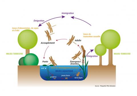 Une autre singularité des odonates, qu'ils partagent avec de nombreux autres insectes, est d'avoir une double vie : la première partie du cycle biologique se déroule dans l'eau et la seconde est terrestre et aérienne, comme le montre le cycle suivant.