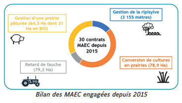 - Les Mesures Agro-Environnementales et Climatiques (MAEC) à destination des agriculteurs souhaitant s’engager dans des pratiques plus respectueuses de l’environnement, 30 contrats engagés