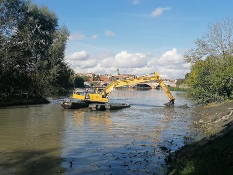 Enlèvement de la vase en octobre 2021 à l’aide d’une pelle amphibie afin de limiter l’impact environnemental, notamment par un accès depuis l’extérieur du bras-mort. Cela a permis de ne pas s’introduire dans la partie abritant la majorité des herbiers à nénuphar jaune, espèce protégée. Environ 1500 m3 de vases ont été extraites et valorisées par épandage agricole.