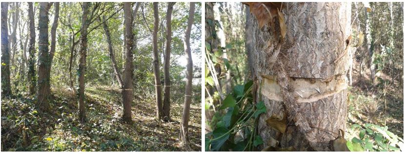 Pour les individus dont la hauteur était supérieure à 2 mètres, une scarification a été réalisé, la première année, sur 90% de la circonférence du tronc. L’année suivante, une nouvelle entaille a été pratiquée sur les ailantes déjà ciblées au-dessus de celle déjà réalisée mais disposée en quinconce. Les plus gros sujets ont fait l’objet d’une nouvelle scarification l’année suivante (2ème ou 3ème selon les individus). Les premières observations montrent un affaiblissement des sujets les plus âgés (peu de rejet de souche, perte du feuillage). Sur les petits sites, dans les zones avec diversité de boisements, beaucoup de descente de cimes sur ces sujets. Des rejets en dessous des scarifications (arrachage annuel), mais peu/pas de rejets de souches.