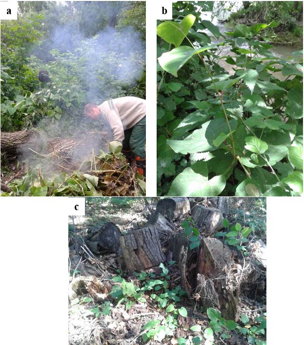 Intervention de Lucane (a), pied de renouée (b) et repousse de la renouée avant la 4ème passe (c) (MIGADO ©)