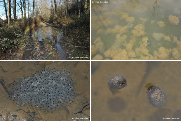 En haut à gauche : un site de reproduction de grenouilles rousses ; en haut à droite et à en bas à gauche : des grappes de pontes ; en bas à droite : des têtards «âgés» de grenouilles rousses - Photos Gilles Pottier