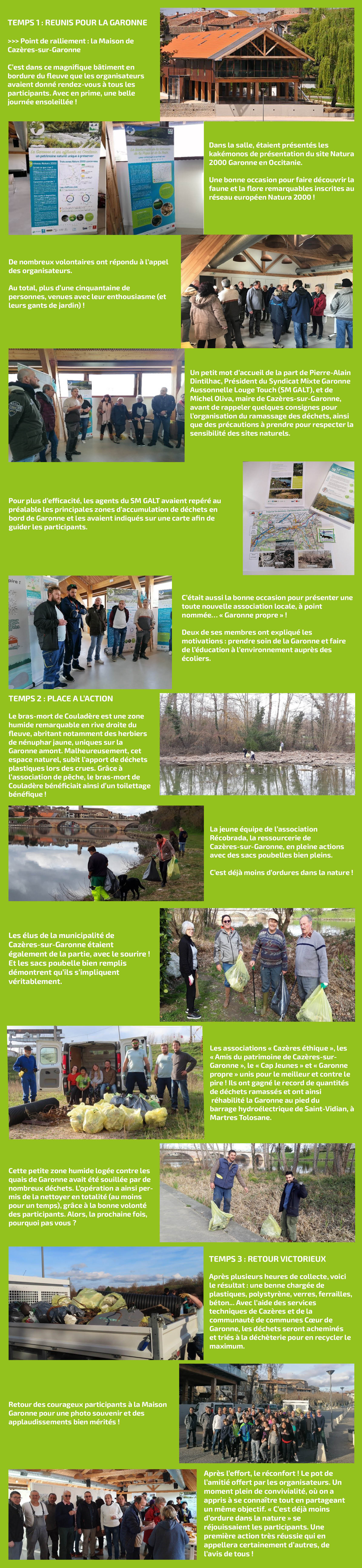 C'est à l'occasion des Journées Mondiales Zones Humides que le Syndicat Mixte Garonne Aussonnelle Louge Touch - ou SM GALT -, la Maison de Garonne et la ville de Cazères-sur-Garonne ont organisé une opération de nettoyage des bords du fleuve. De nombreuses associations avaient répondu présentes : ainsi, il y avait les Amis du patrimoine de Cazères, La Gaule cazérienne, la base nautique, la ressourcerie Récobrada, le Cap jeunes, Cazères éthique et Garonne propre. Parmi les structures institutionnelles, étaient mentionnées la Communauté des communes Coeur de Garonne, l'Agence de l'eau Adour Garonne et EDF. Le SMEAG - coordinateur Natura 2000 du grand site "Garonne en Occitanie" -, le Conseil départemental de la Haute-Garonne - structure animatrice Natura 2000 -, et Nature En Occitanie - son assistant maître d'ouvrage - étaient également partenaires de cette manifestation.
