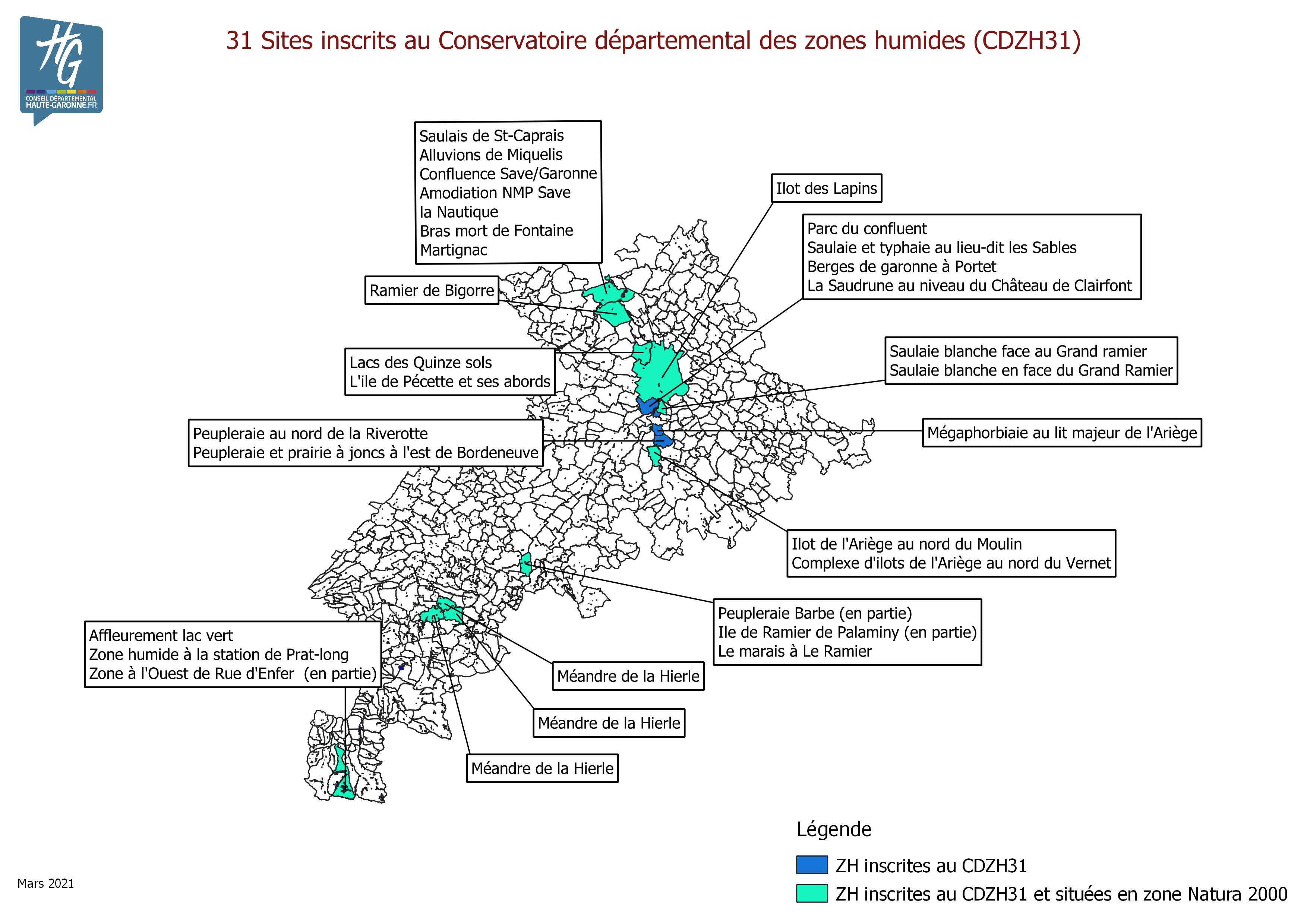 En février 2021, 31 sites sont d'ores-et-déjà classés au conservatoire départemental des zones humides pour une surface de 340 Ha. Parmi ces 31 sites, 28 sont situés sur des sites Natura 2000 du département, montrant ainsi les grandes interactions entre les politiques N2000 et zones humides sur nos territoires. En outre, un complexe de 12 zones humides d'intérêt patrimoniale d'une surface de 43 Ha sur la commune de Melles fera l'objet d'une inscription au CDZH31, lors de la prochaine session prévue en avril 2021.