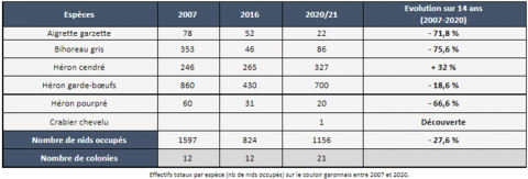 Les principales conclusions sont une diminution des effectifs pour la plupart des espèces en 14 ans (comparaison de 2007 à 2020).Le héron cendré semble être en légère augmentation. Les colonies qui étaient auparavant peu nombreuses mais très populeuses, ont eu tendance à s’éclater en plusieurs petits sites. Un phénomène que l’on retrouve également au niveau national. On compte aujourd’hui 17 colonies de hérons cendrés sur le couloir garonnais et sa périphérie (bande tampon de 10 km). Autre « bonne nouvelle » : l’arrivée du crabier chevelu. Malgré une présence régulière de l’espèce au printemps depuis 10 ans, la première reproduction certaine est enfin identifiée en 2020 sur le territoire. Chez le héron garde-bœufs, les variations d’effectifs peuvent être importantes d’une année sur l’autre. Sur la période considérée, on note une légère diminution du nombre de couples nicheurs. Le nombre de colonies connues est actuellement de 5. Cette diminution est nettement plus marquée chez les trois dernières espèces, qui ont perdu entre 60 et 80% de leurs effectifs en 15 ans : le héron pourpré (3 colonies, mais une seule renferme quasiment tous les individus), l’aigrette garzette (6 colonies) et le bihoreau gris (7 colonies). Le blongios nain est toujours resté rare mais malgré une pression ornithologique croissante, il est de moins en moins observé. Les dernières reproductions régulières de ce petit héron remontent au début des années 2000.